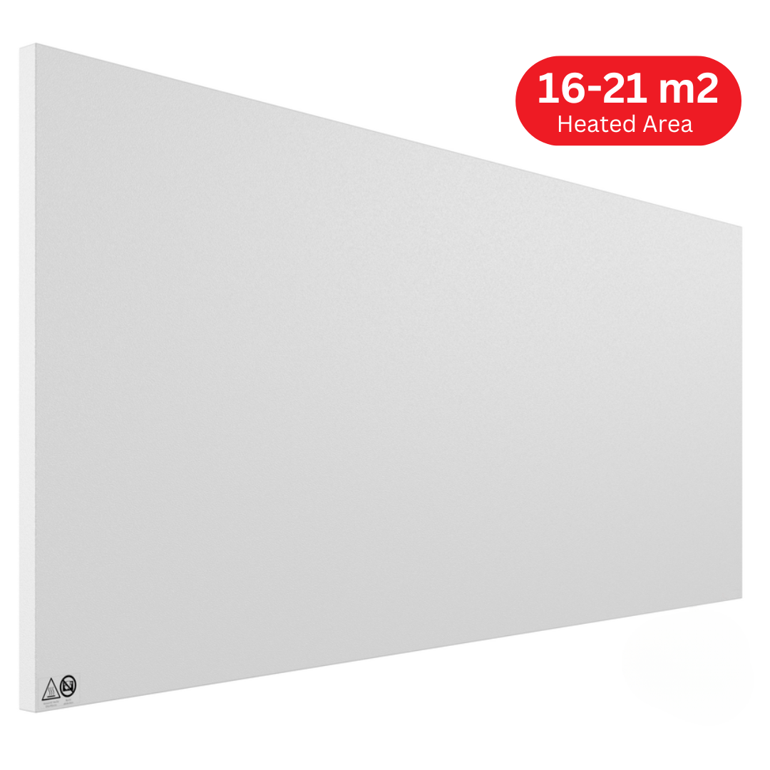 Measuring 1100mm x 700mm x 25mm, this 1100W infrared panel heater is designed to warm a moderately insulated area of approximately 16–21m². Its ultra-slim profile allows for wall or ceiling installation, keeping floors and walls clear for a clean, modern interior with full flexibility over furniture placement.