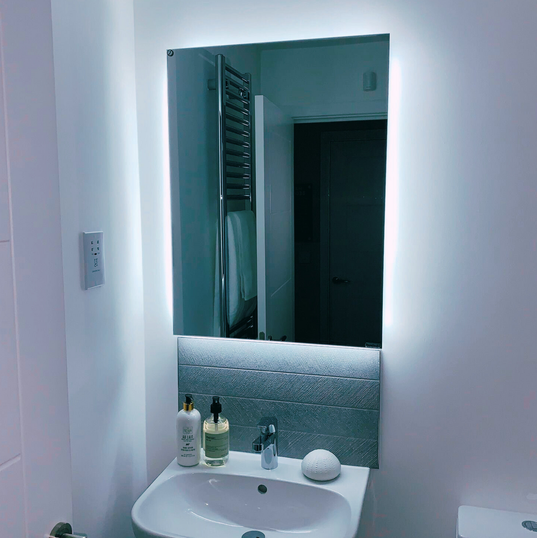 This 450W Solstice Mirrored IR Panel Heater With LED Backlight perfect for a bathroom or bedroom.